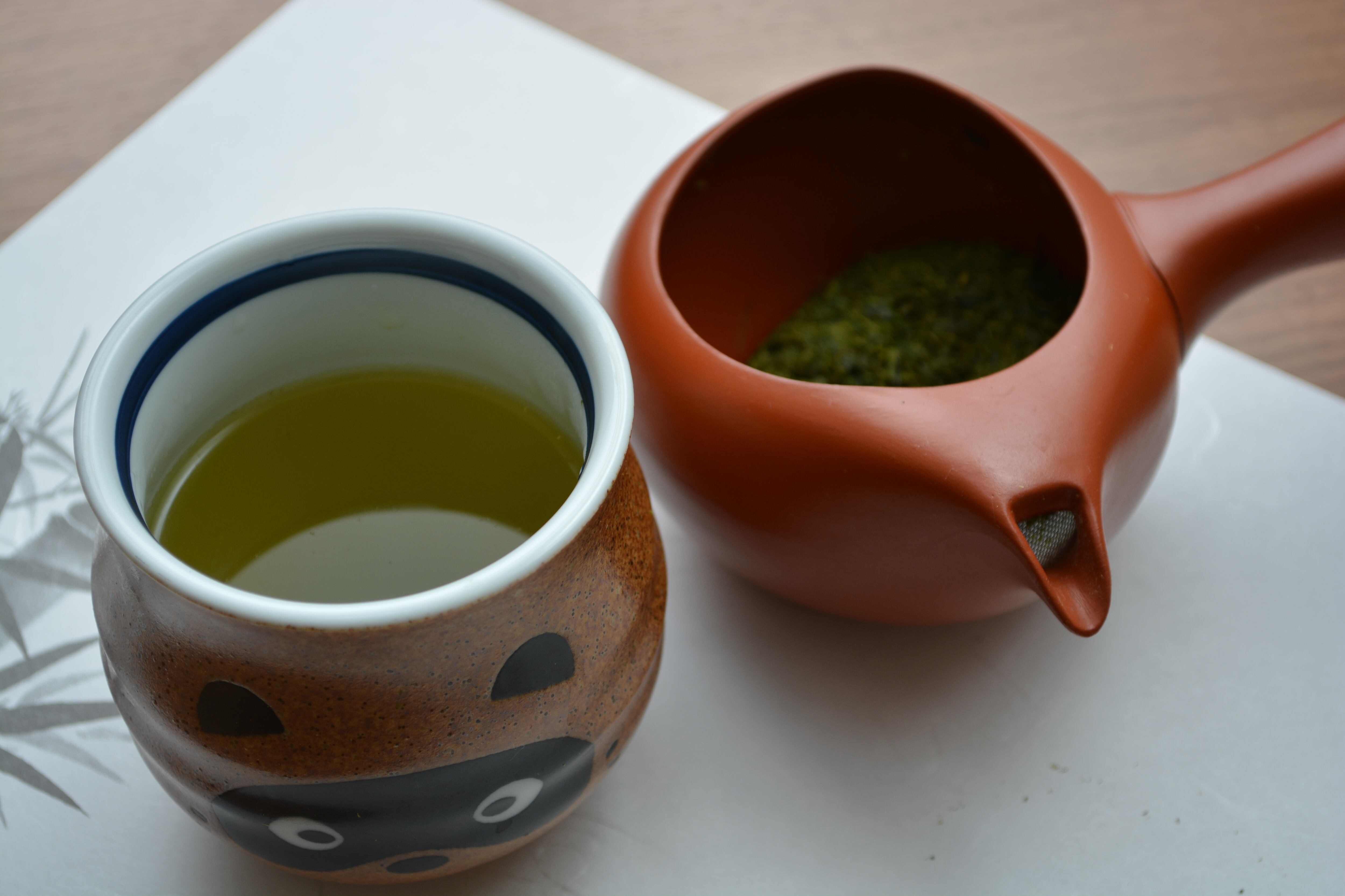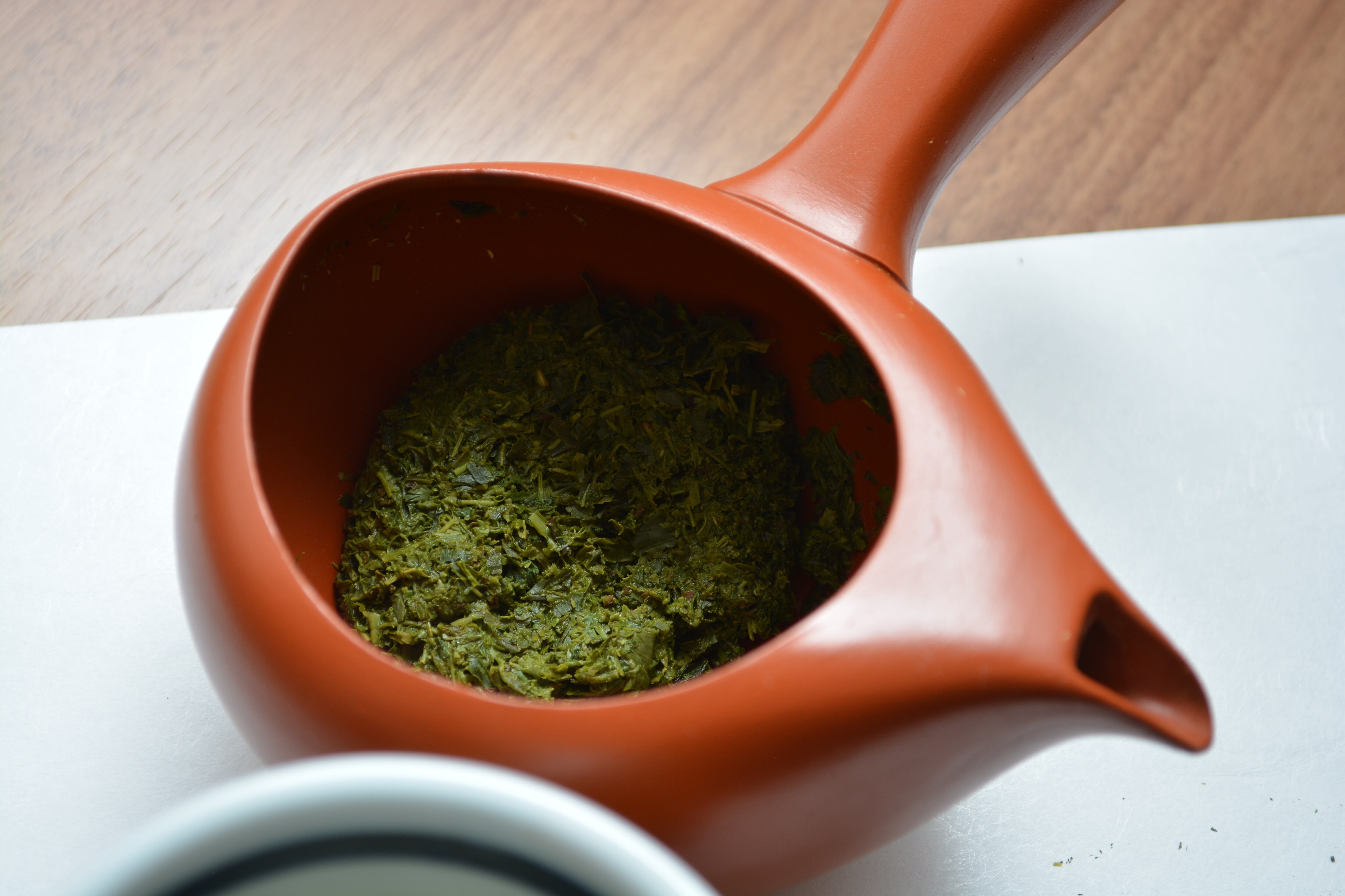 茶葉は8g。葉が細かいので、特蒸し用急須をおすすめしますが、陶製茶こしでもほぼ詰まることなくしっかり淹れられます。湯呑みやマグカップに一度熱いお湯を注ぎ、そのまま急須に移して30秒。注ぐときは、急須を何度か返して濃い目に出すのがおすすめです。